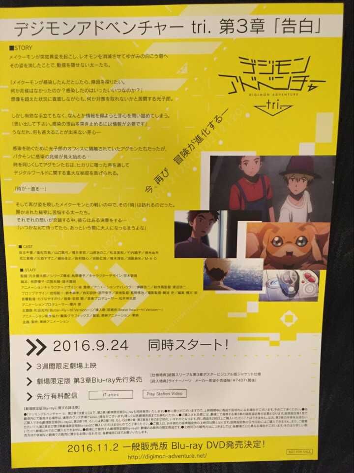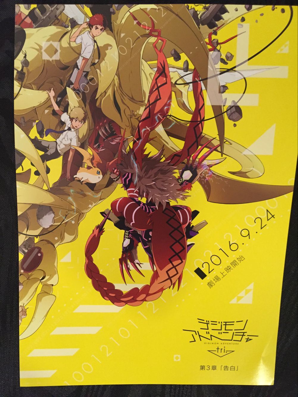 - O primeiro anunciando o tema de encerramento do novo OVA de Digimon Adventure tri., que se chamará "Boku ni totte", e será interpretado pela Knife of Days, a banda do Matt no anime.- O segundo foi o novo trailer de Digimon Adventure tri. (Confissão), que você pode assistir clicando aqui.- E o terceiro foi um comercial dos Appmon, anunciando o lançamento dos produtos para o dia 8 de outubro.