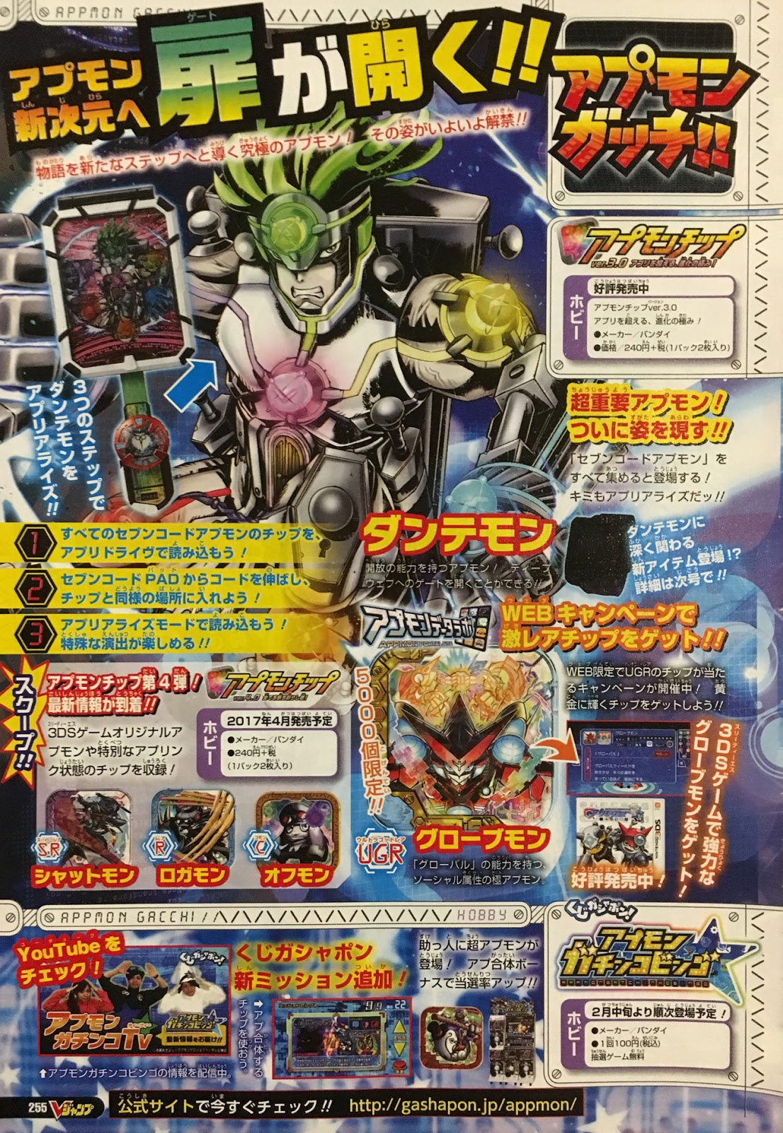 Dantemon: Um Appmon com capacidade de liberação! Ele é capaz de abrir o portão para a Deep Web!"Ao lado do Dantemon estão alguns novos produtos, que chegarão em breve às lojas. Eles foram inspirados nesse personagem. E mais abaixo, alguns novos chips Appmon.