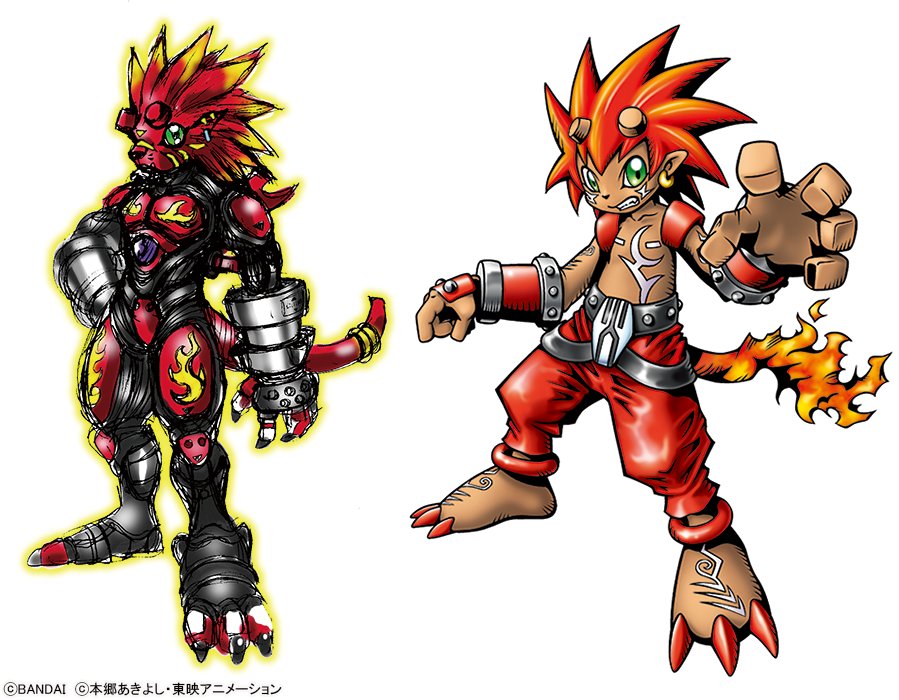 No lado esquerdo temos um Digimon, que seria chamado Glyphmon (グリフモン), enquanto no lado direito temos o conceito original do que mais tarde se tornaria o Flamon (フレイモン).